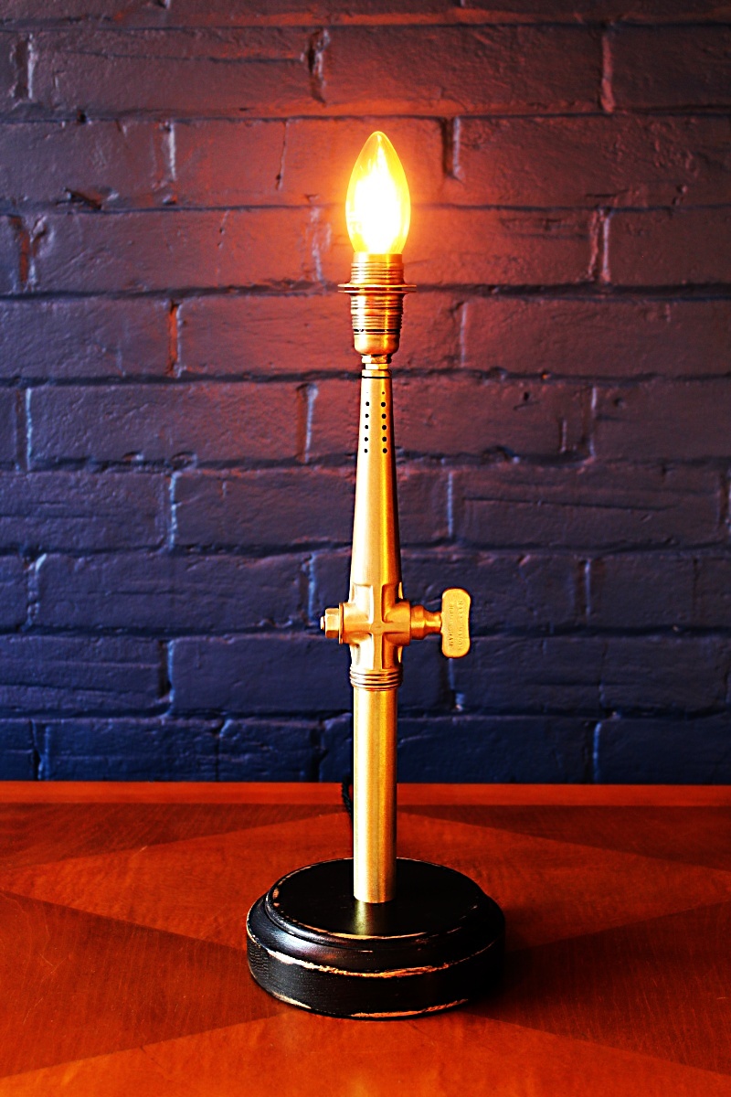 A quirky antique brass beer barrel tap polished to a brushed brass finish and converted to a lamp using recycled brass extending rods.