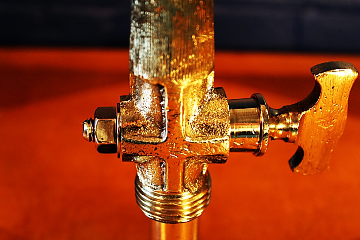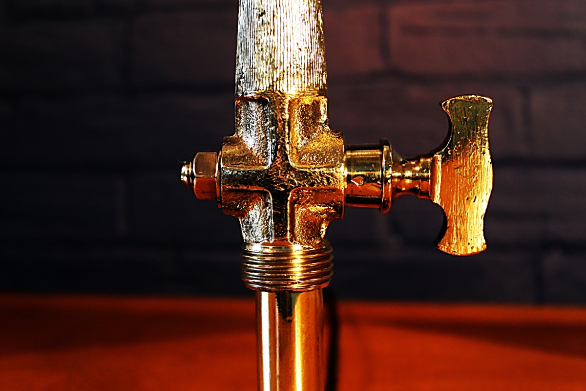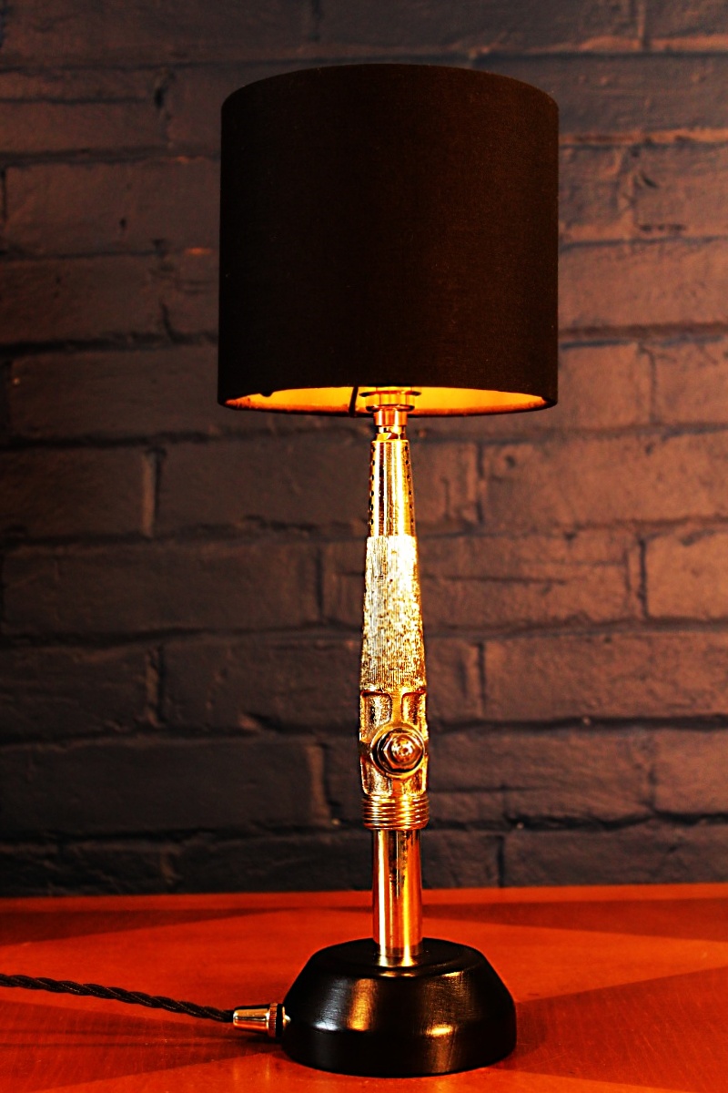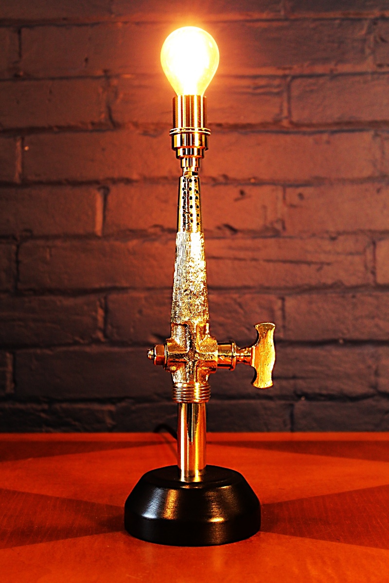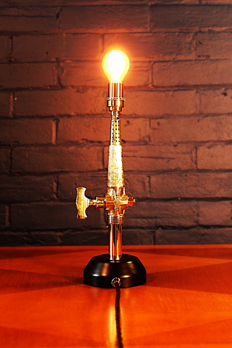 Vintage brass beer barrel tap extended using brass inner tubes from our smaller fire extinguishers for maximum upcycling potential. Topped with a solid brass SES lamp holder by S Lilley & Son, this bespoke little lamp really shines.
