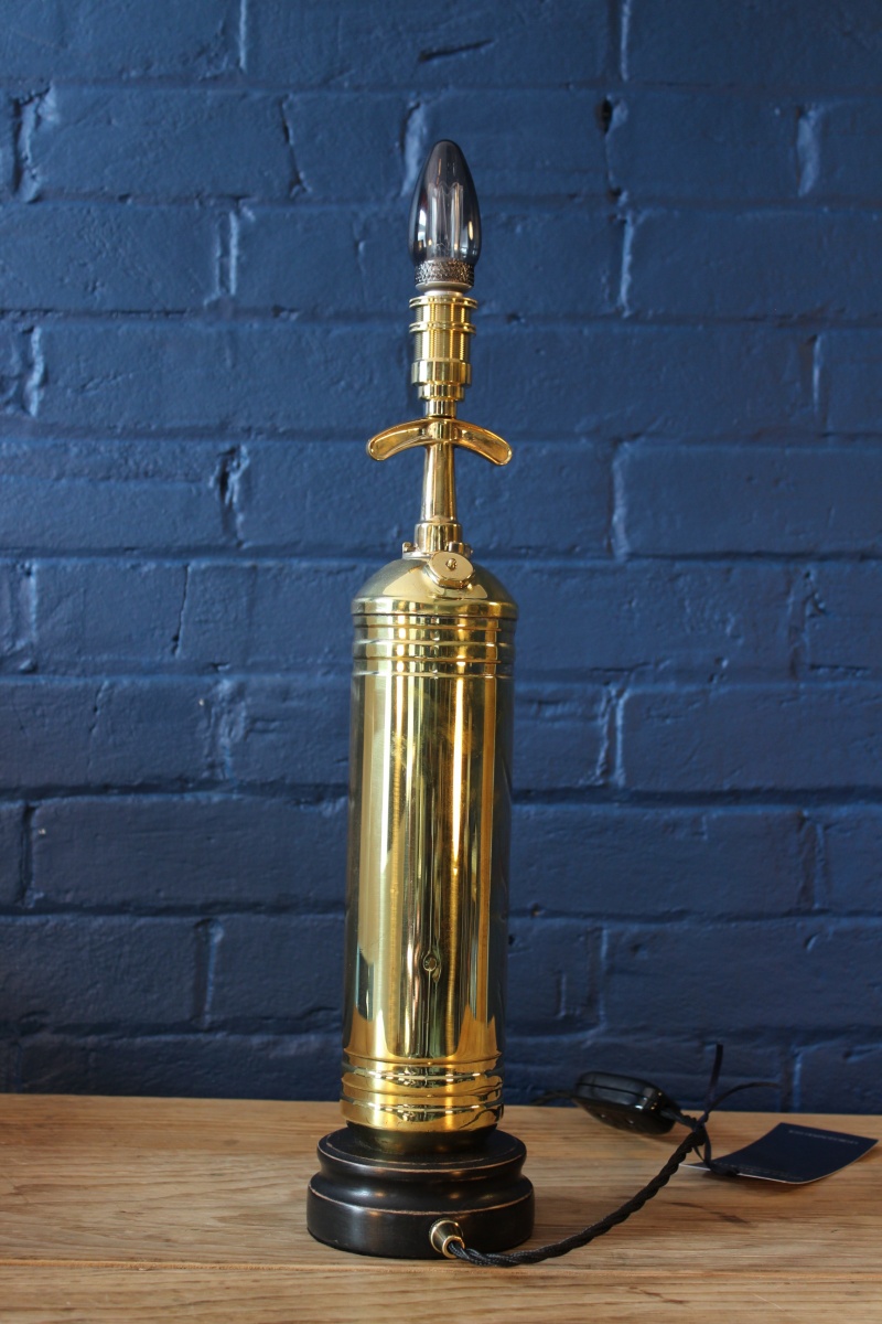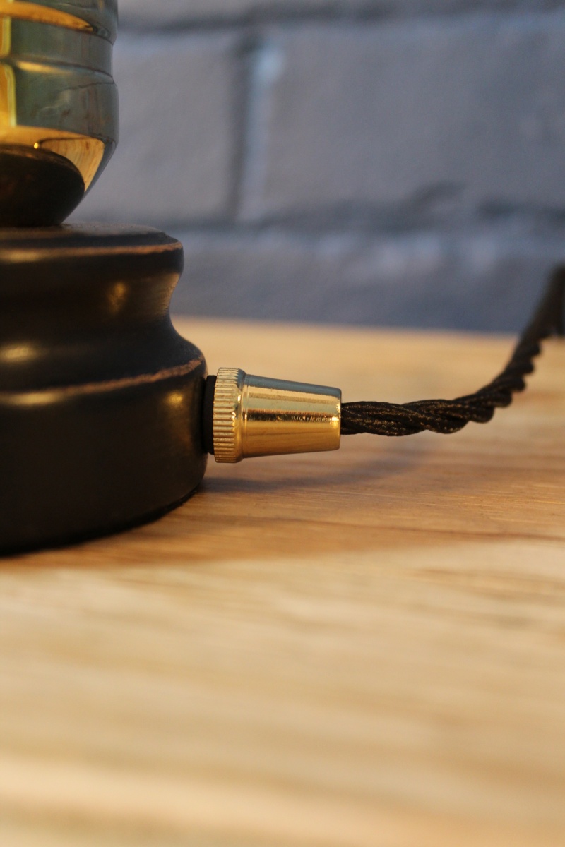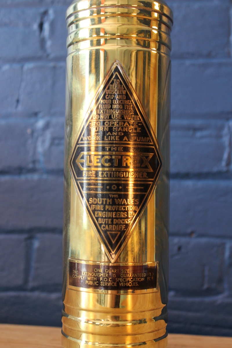 A fabulous brass transport fire extinguisher branded Electrex of Cardiff. This wonderful industrial piece has been polished to perfection and is mounted on one of our slim, hand turned bases, enhanced by our matching British-made lamp holder, cable grip and finished in black twisted Italian flex.
