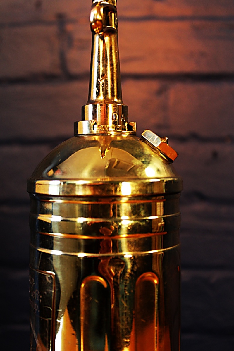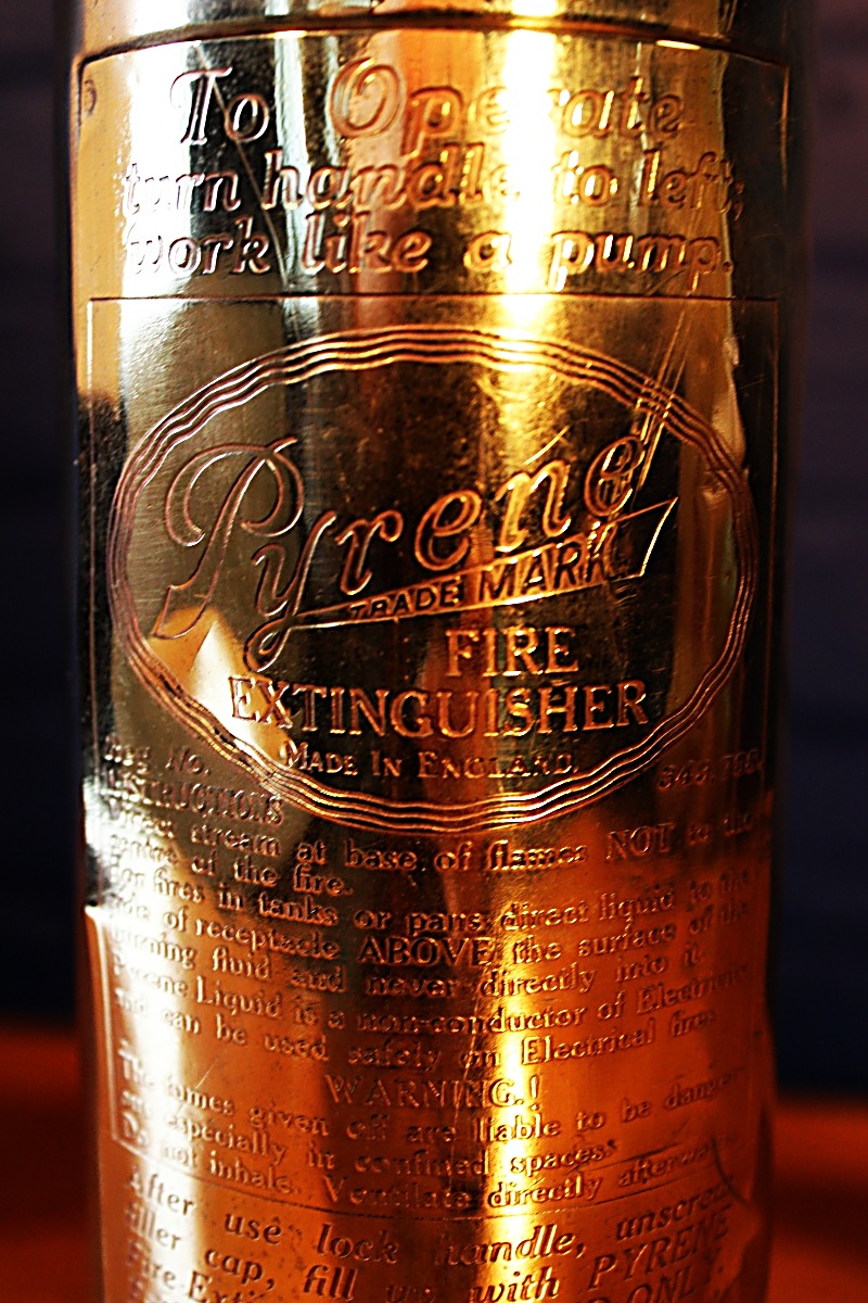 A fabulous vintage Pyrene vehicle fire extinguisher in gleaming brass with stamped lozenges to the back. Perfect as a bedside lamp or for a petite occasional table.