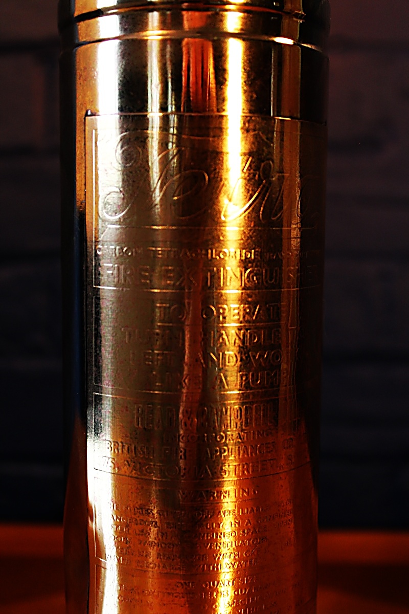 A fabulous vintage Tetra vehicle fire extinguisher in gleaming brass with stamped lozenges to the back. Perfect as a bedside lamp or for a petite occasional table.