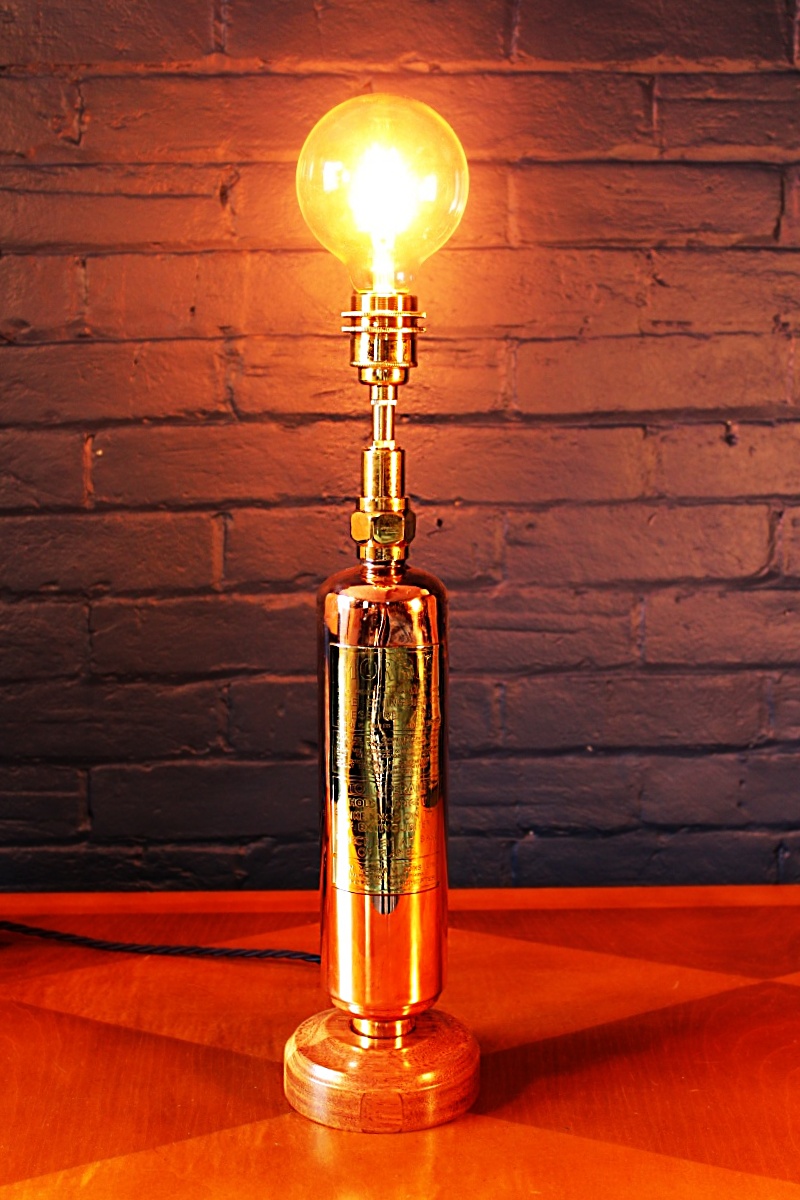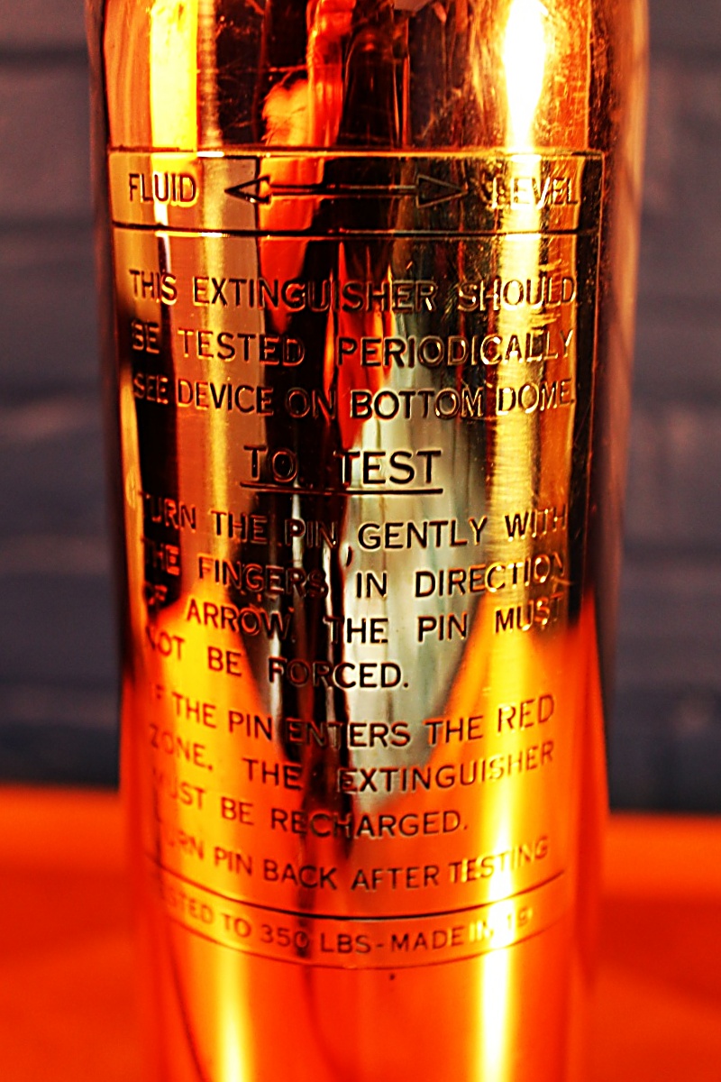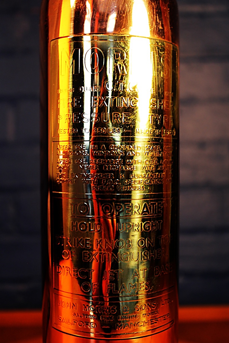 Vintage Morris fire extinguisher lamp. Really stunning labels front and back on this copper and brass cylinder mounted on a pale wood base.