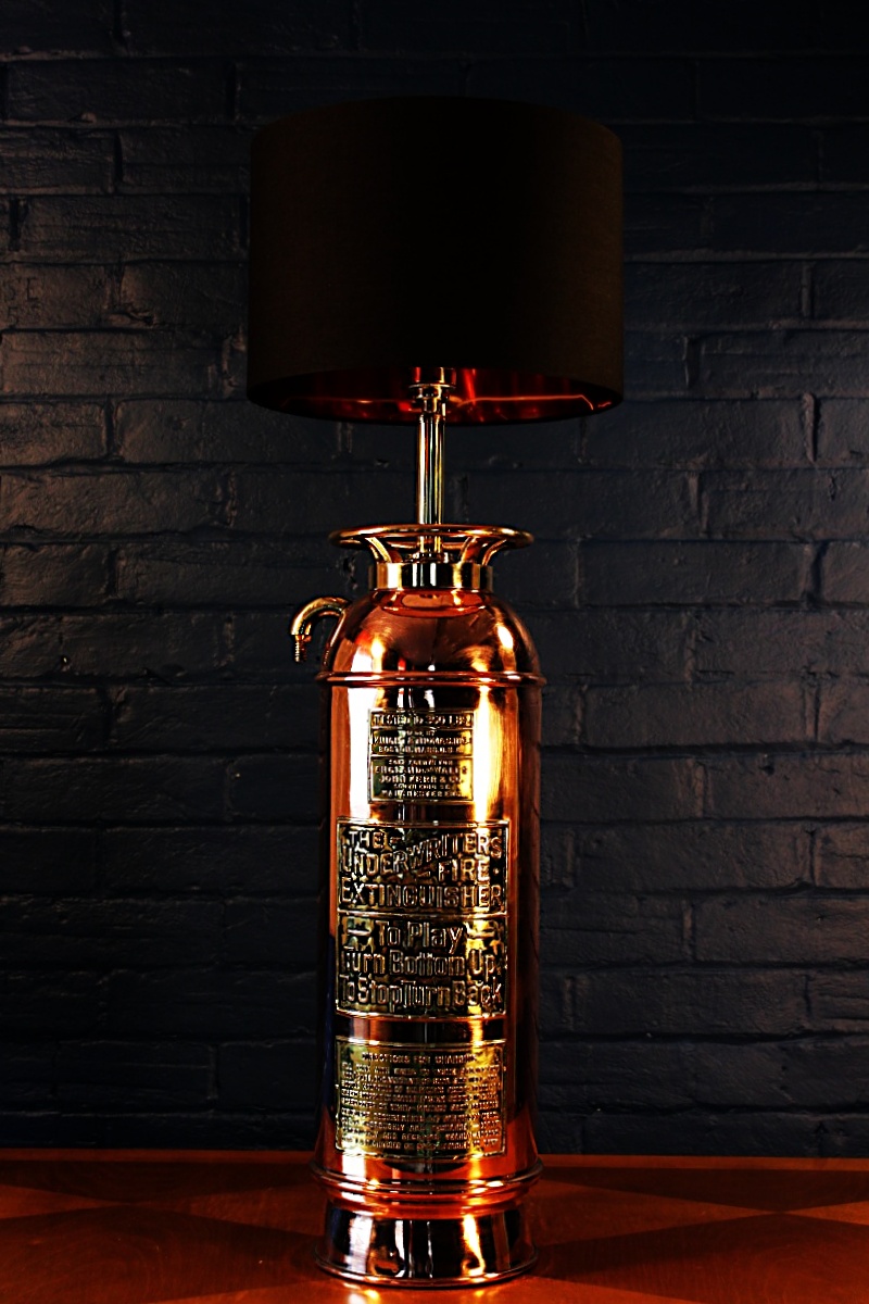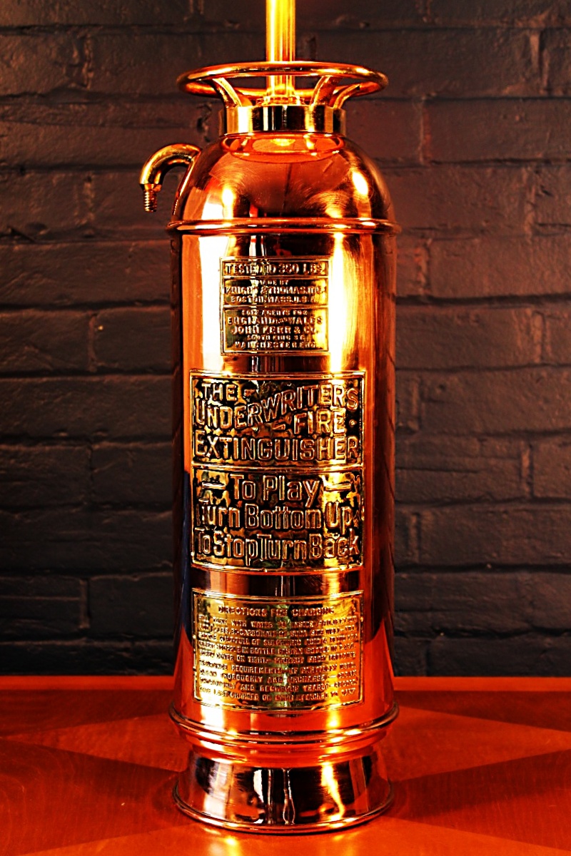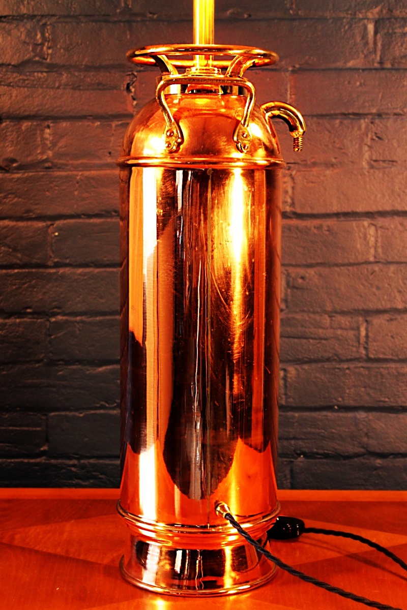 Wonderful Underwriters copper and brass antique fire extinguisher lamp. The splayed base is a great feature on this highly polished lamp – a real statement piece!