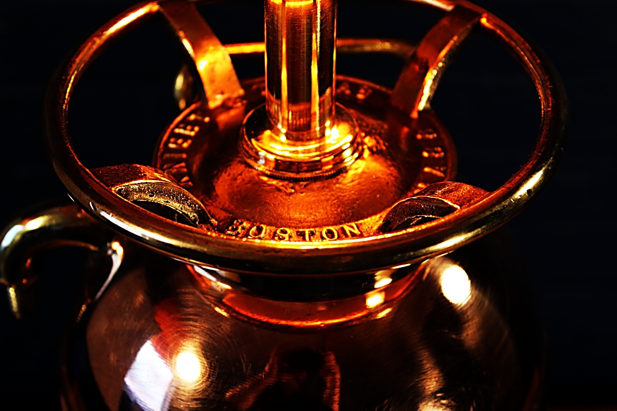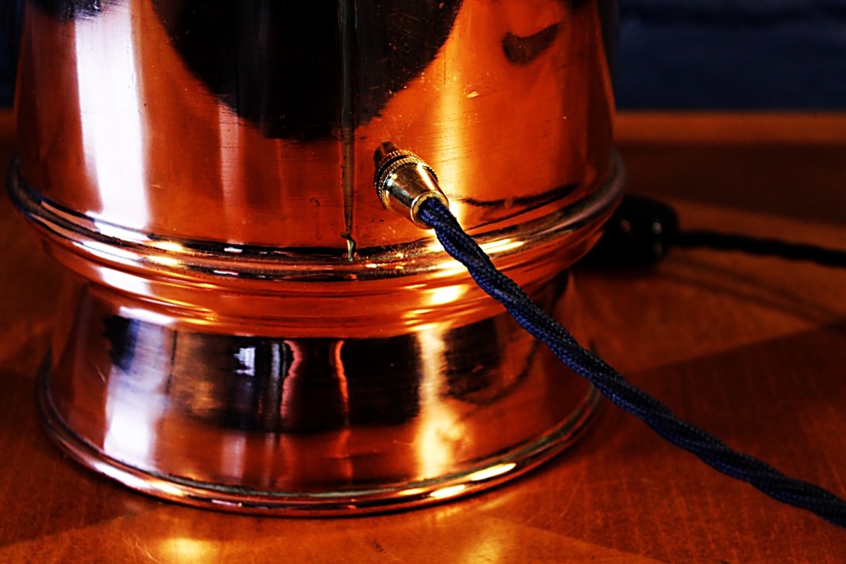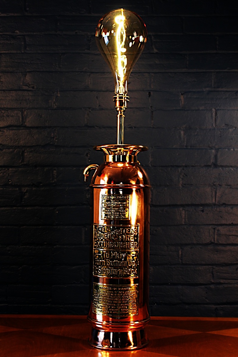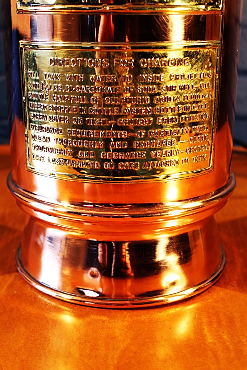Wonderful Underwriters copper and brass antique fire extinguisher lamp. The splayed base is a great feature on this highly polished lamp – a real statement piece!