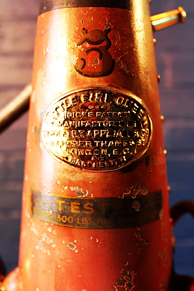 Vintage Dick’s Little Fire Queen fire extinguisher lamp. Gorgeous conical fire extinguisher with wonderful detail on the label – we love the name!