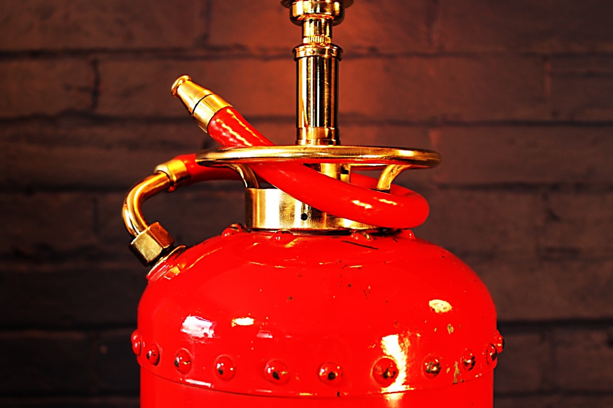 Vintage L & G fire extinguisher with original livery. The original red paint is really eye-catching on this 1965 riveted steel fire extinguisher with gorgeous labelling and contrasting brass fittings.