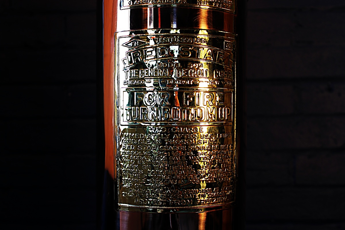 Vintage American Red Star fire extinguisher in gorgeous copper and brass. This striking mid-century piece also works as a floor standing lamp.