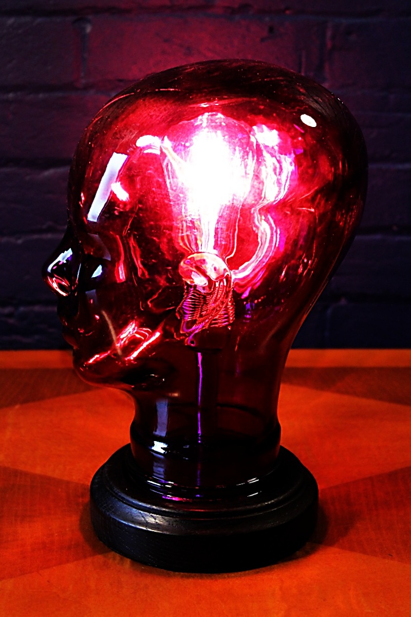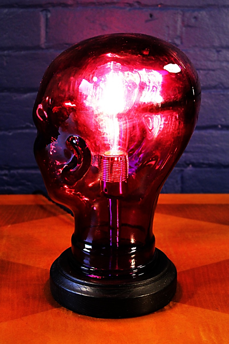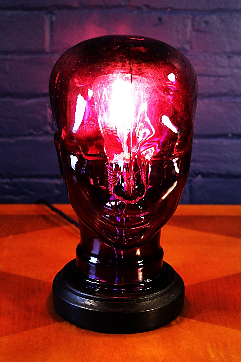 Impactful purple recycled glass shop display head converted to a lamp on a base turned in our workshop. Newly wired and PAT tested.