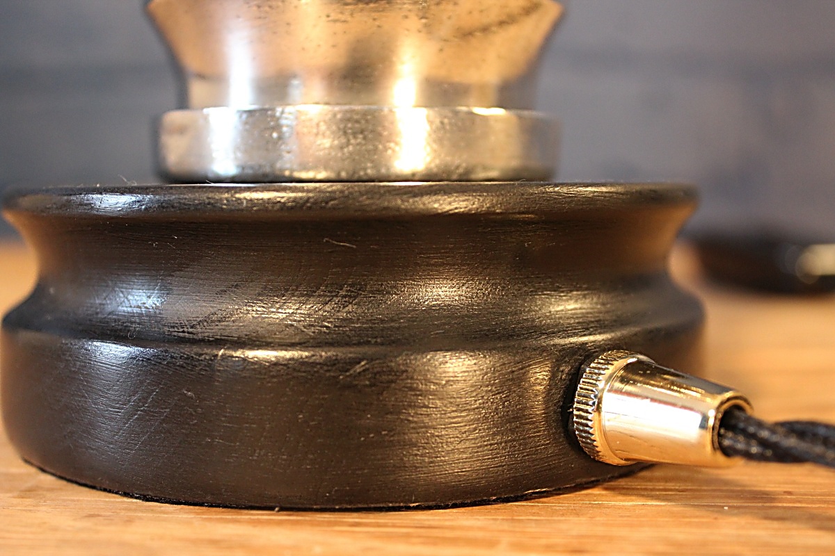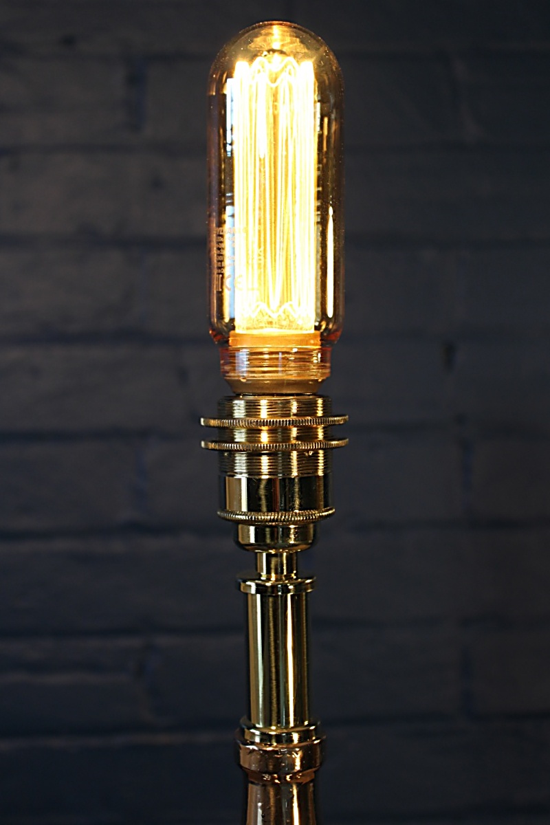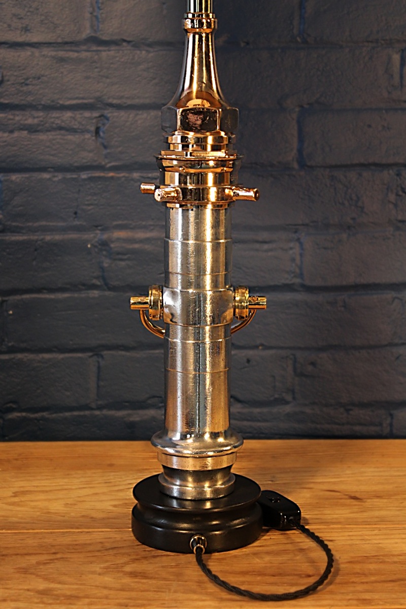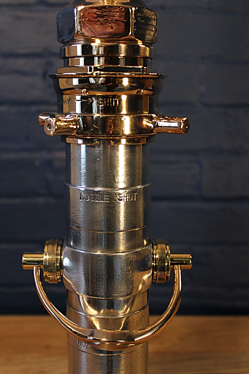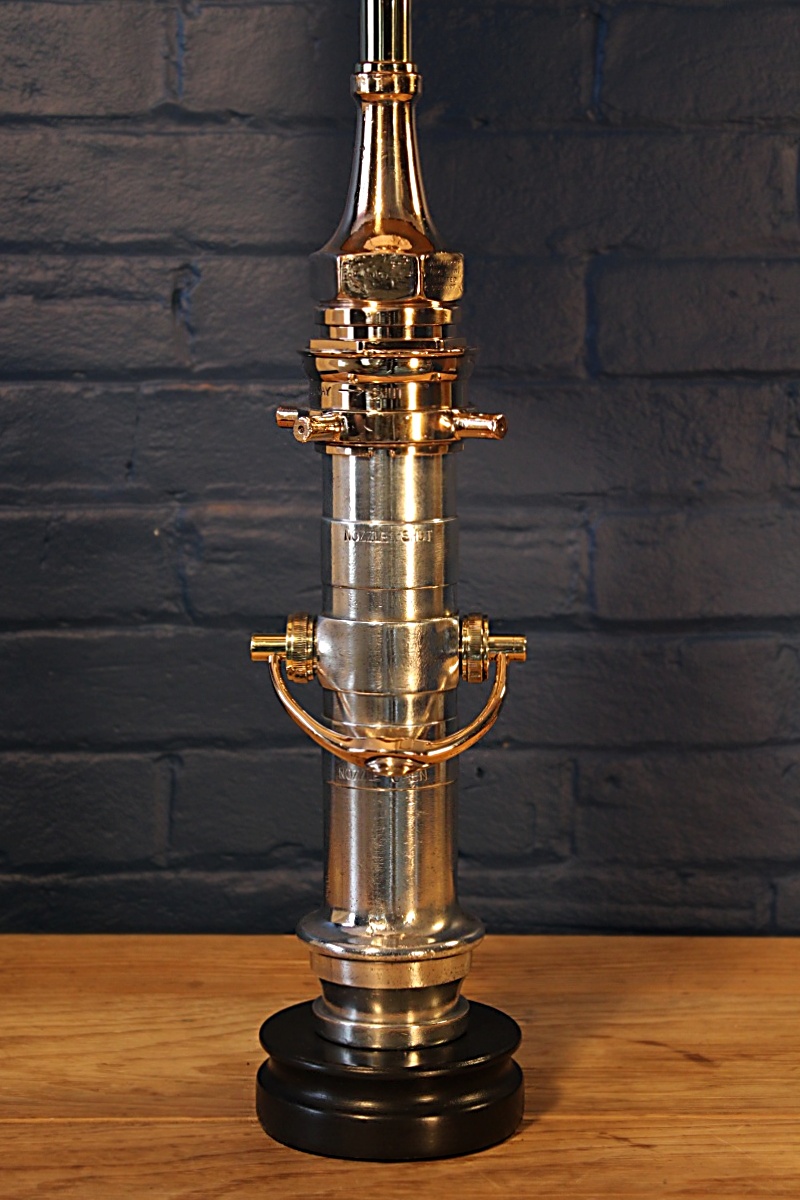 The London Nozzle – a classic! Standing majestically on one of our hand-turned wooden bases, this fire branch by well known maker John Morris of Stockport would have been in active service with the fire brigade until the end of the 20th century and shows some fabulous signs of use. It’s a favourite with our fire-fighting clients for its statuesque beauty and the nostalgia of using one during their service. The gleaming brass contrasts so stunningly with the polished aluminium. We’ve complemented this wonderful fire branch with matching brass lamp holder, cable grip and Italian twisted flex.