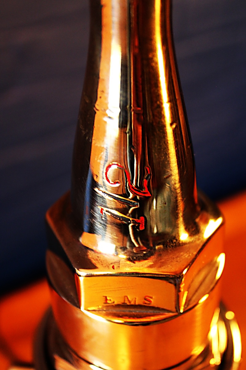 A striking vintage London Nozzle fire branch table lamp in aluminium and contrasting brass. This example has an unusual bulbous silhouette. These classy fire nozzles have been in use with the London fire brigade until recent times and are an excellent birthday or retirement gift for the firefighter or hero in your life.
