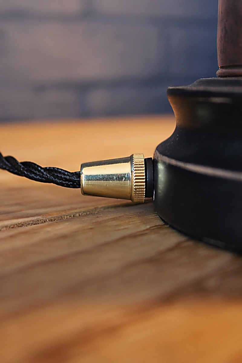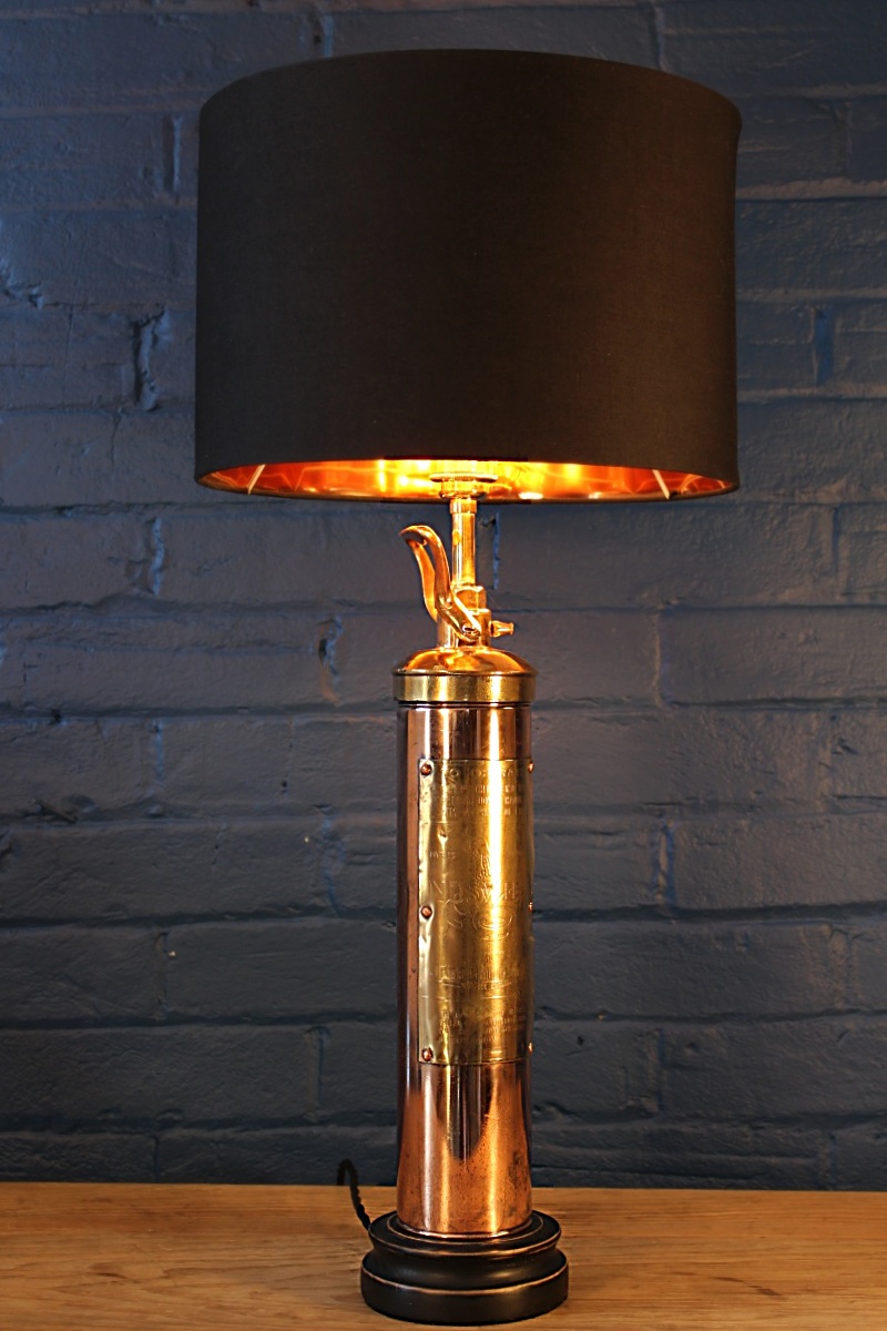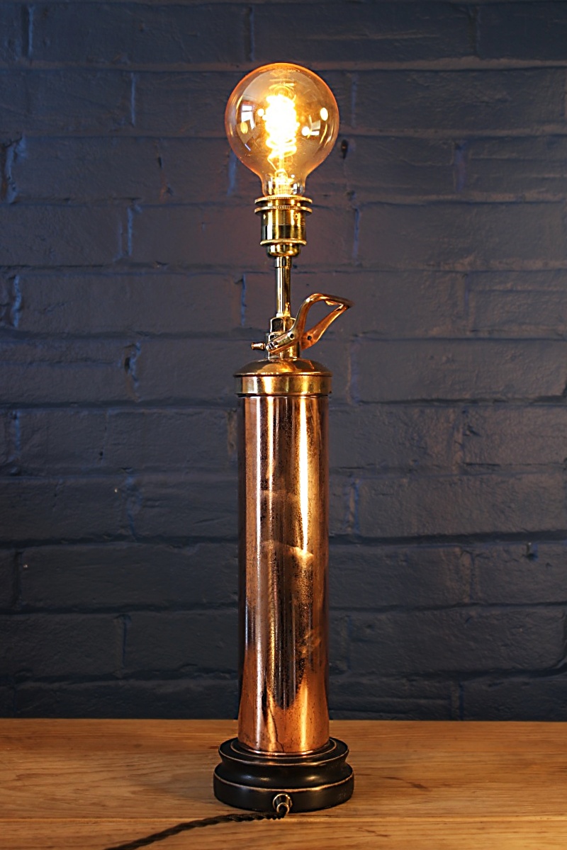 A fabulous copper and brass transport fire extinguisher branded Nuswift. This wonderful industrial piece has been polished to perfection and is mounted on one of our slim, hand turned bases, enhanced by our matching British-made lamp holder, cable grip and finished in black twisted Italian flex.