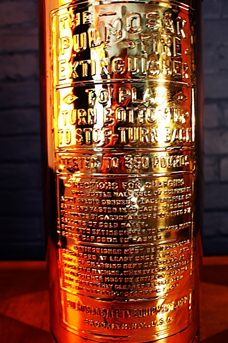 The “Pulmosan” fire extinguisher in glorious copper and brass converted to a stunning lamp. Made in Brooklyn, New York in the early 1900s, this antique extinguisher makes a wonderful floor standing or table top lamp for an all round glow in your home. All enhanced by our matching lamp holder, cable grip and finished in twisted Italian flex.