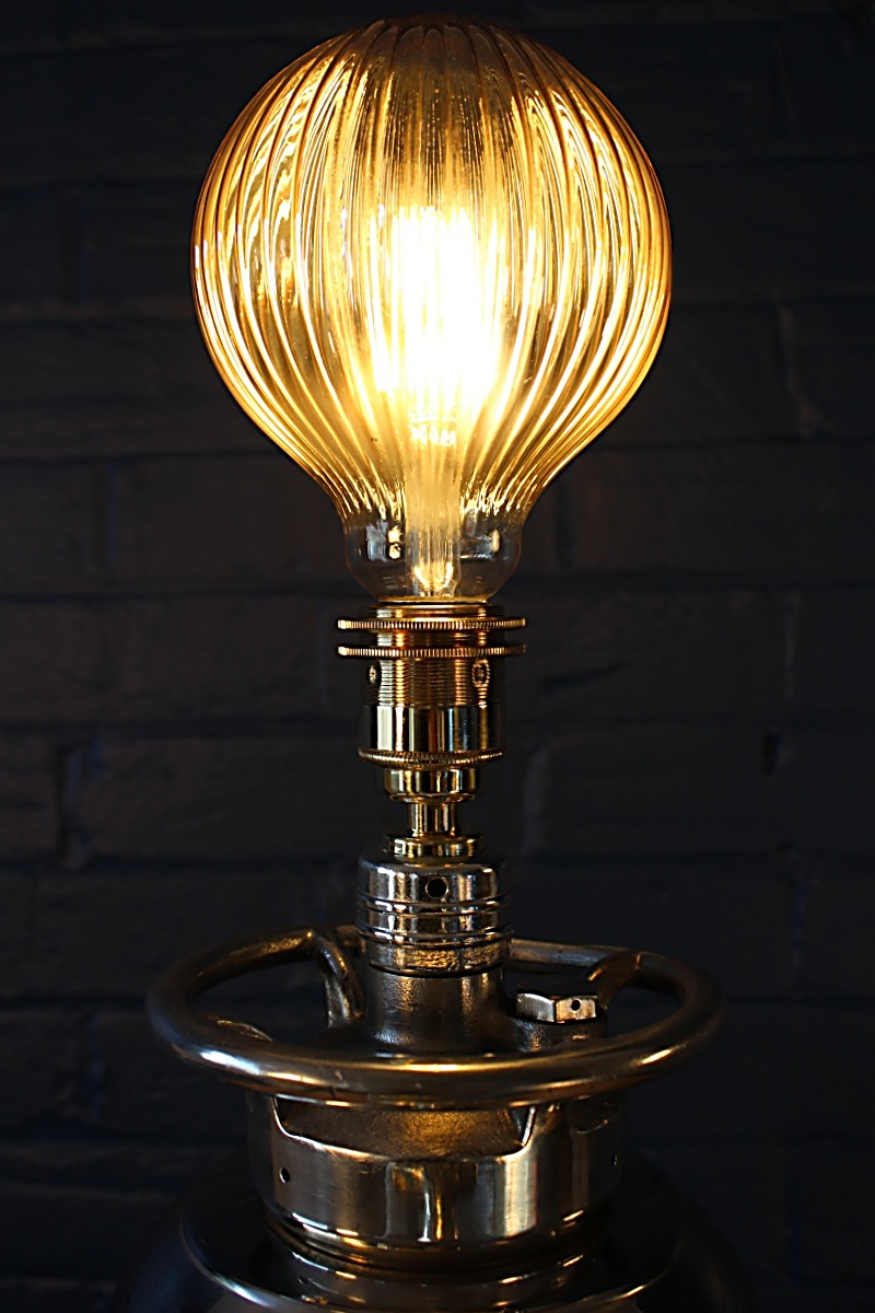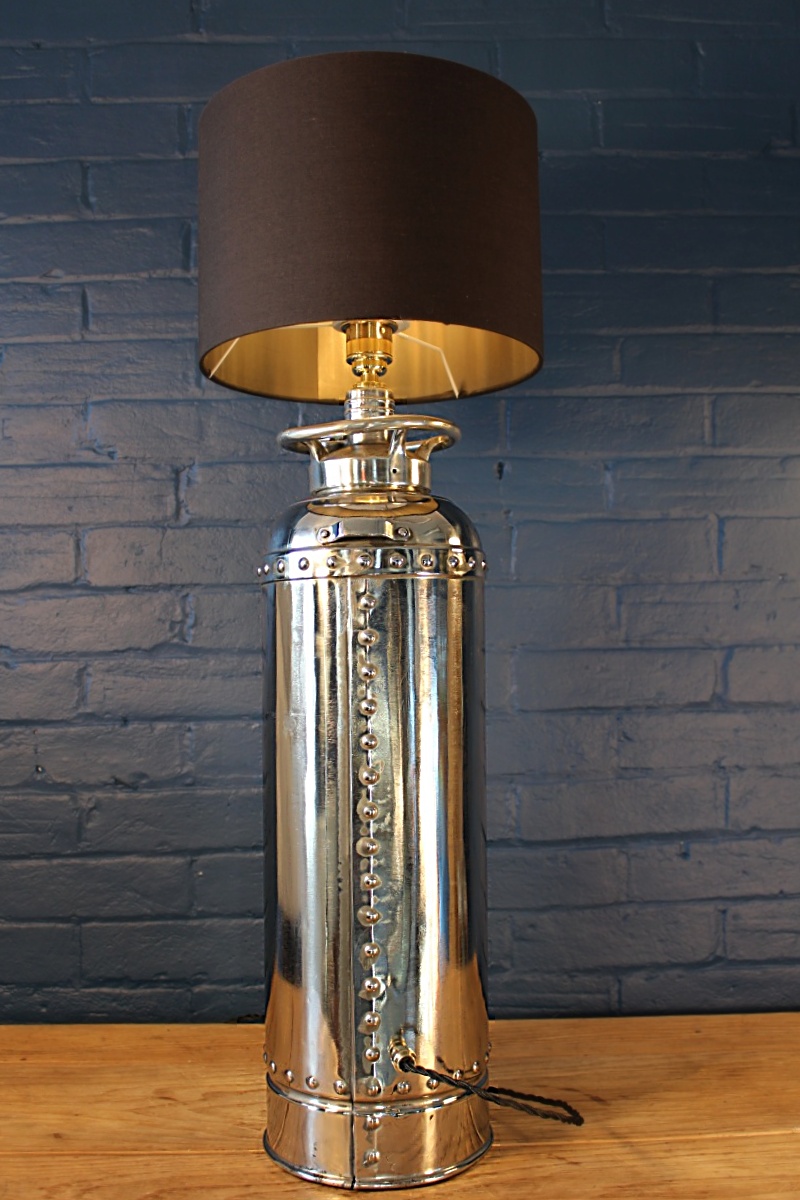 Fabulous highly polished steel fire extinguisher table lamp from the 1950s. We love the riveted silver body of this vintage steel fire extinguisher which has been polished to perfection and is completed with an aluminium top and fittings including our top notch quality brass lamp holder and cable grip. A black Italian flex and inline switch finish the look.