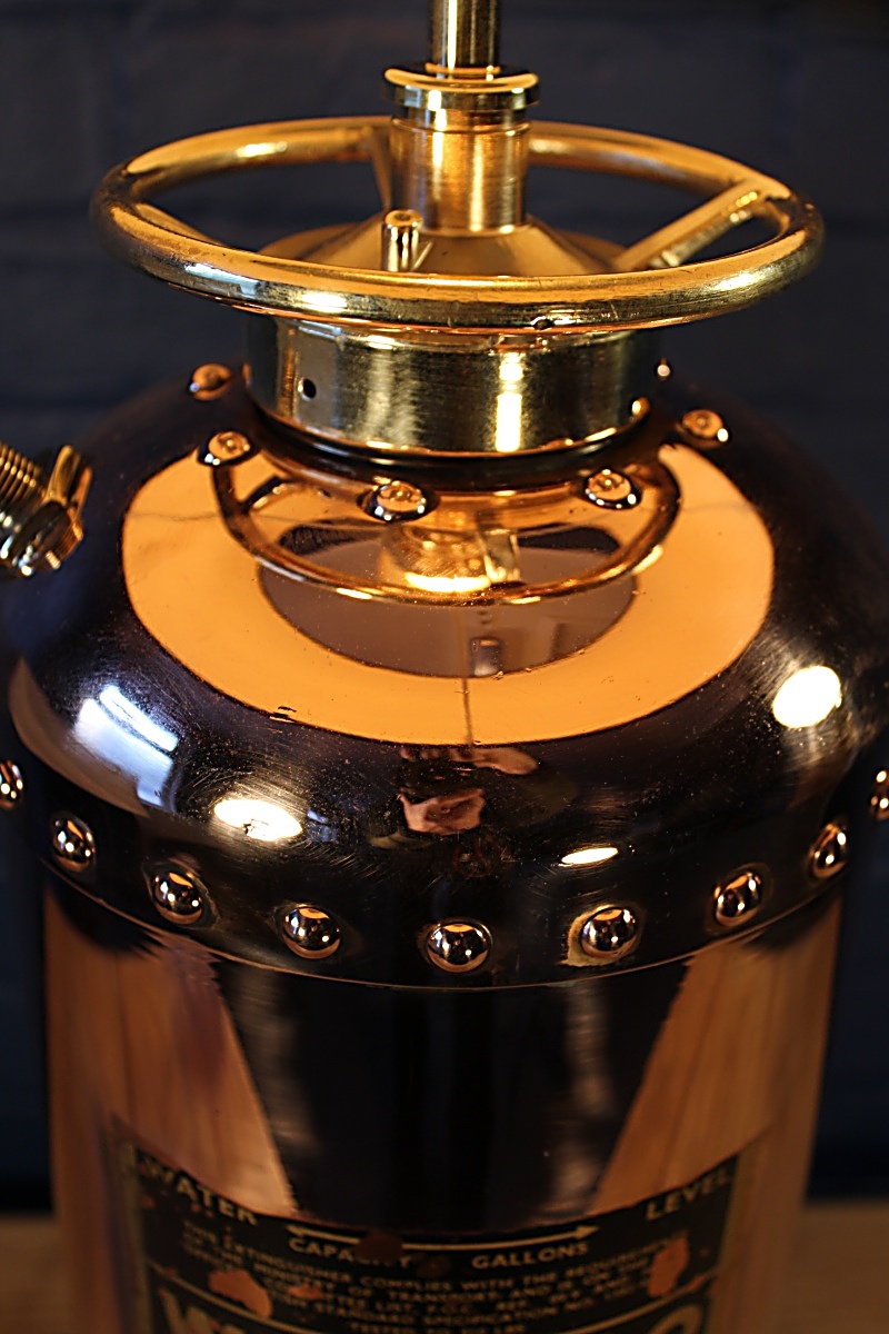 Stunning copper and brass Waterloo fire extinguisher lamp with original black label. Dated 1961, the quality of copper shines through in rich tones and the gleaming brass fittings are polished to perfection. We’ve lacquered the label to retain the stunning paintwork and design.